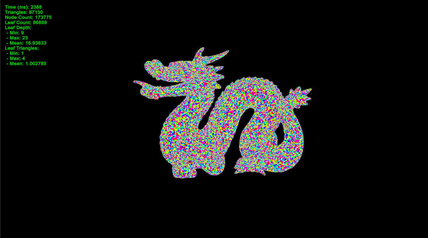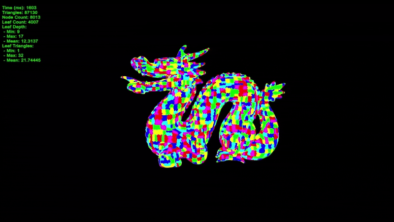 BVH 구조를 보기위해 노드마다 색을 정해서 같은 노드에 포함된 삼각형은 같은 색이 되도록 해봤습니다.